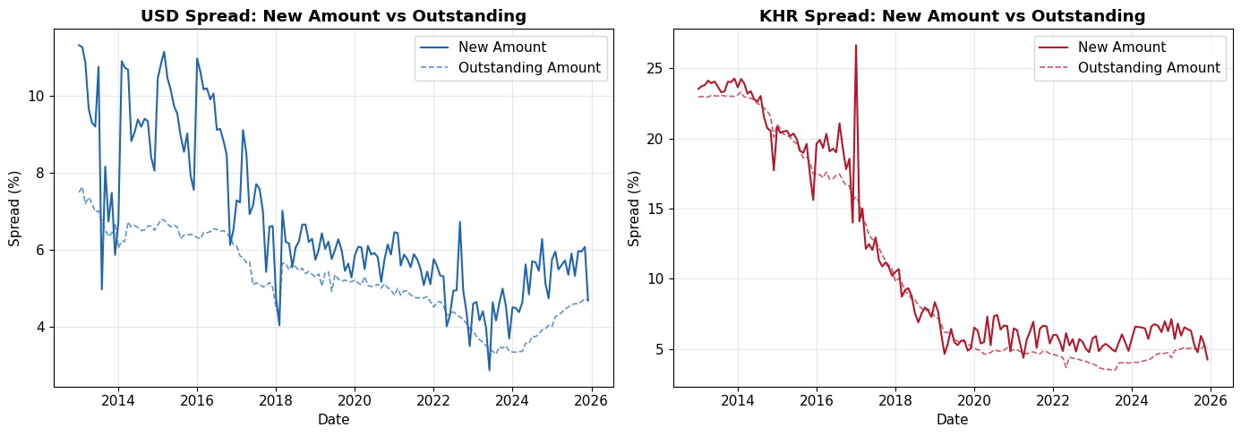 print(f"Saved: spreads_khr_outstanding.csv ({len(df_khr_robust)} rows)")Saved: spreads_usd_outstanding.csv (156 rows)