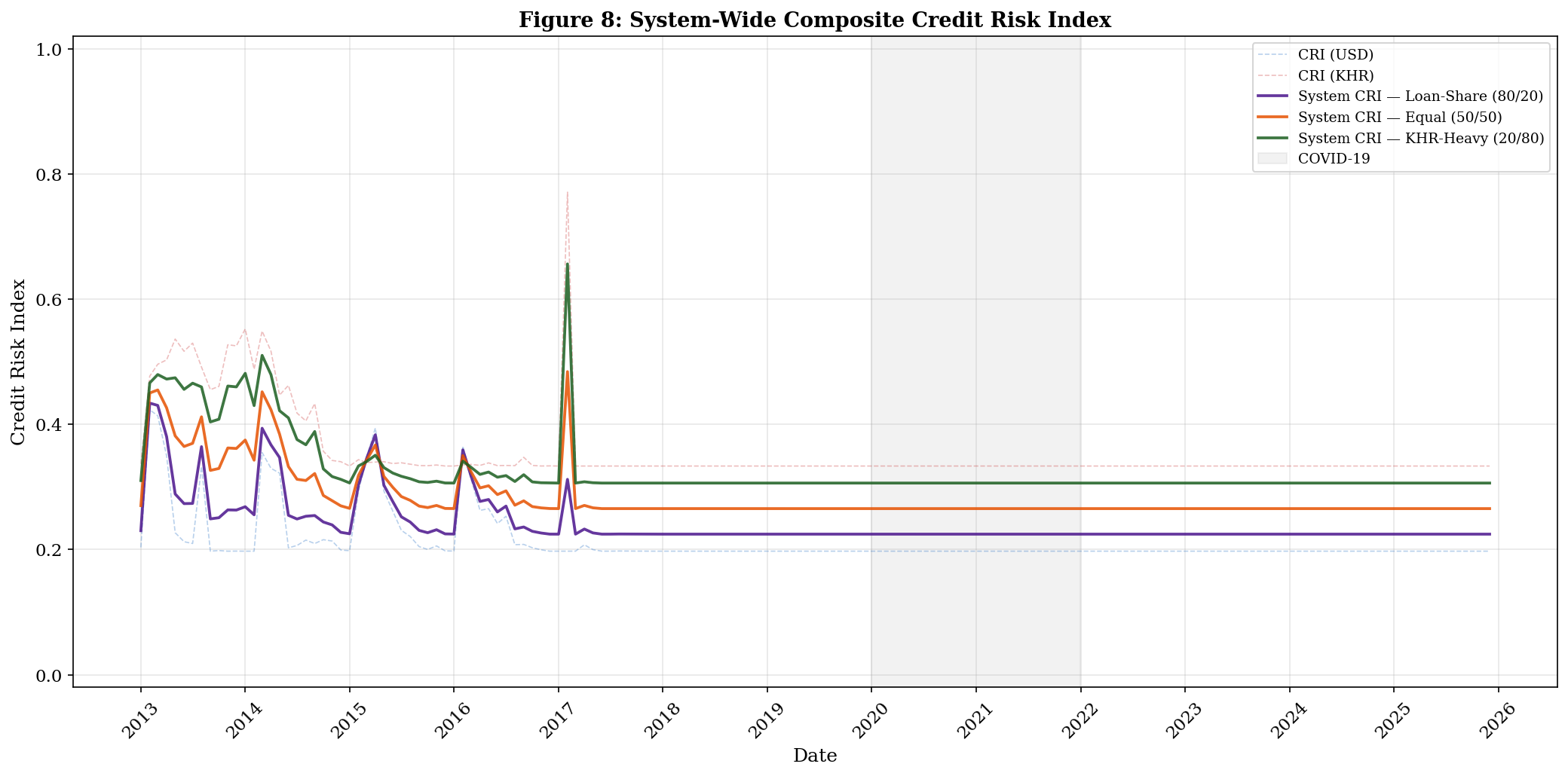 Policy Implication: As Cambodia de-dollarizes and KHR lending grows, the system CRI will naturally shift from the 80/20 line toward the 50/50 or even 20/80 line. If KHR spreads retain their higher structural volatility, this could mean the system-level credit risk increases even as the economy transitions away from dollar dependence — an important cautionary finding.