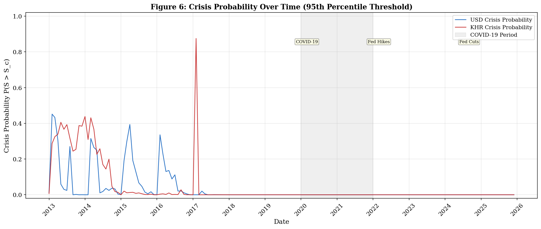 KHR Crisis Probability: - Shows a more dramatic swing: extremely high probabilities (50–80%) in 2013–2017 when KHR spreads were 15–27%, reflecting the genuine credit risk in the immature riel lending market. - Rapid decline to zero after 2018 as spreads compressed below 8%. The threshold of ~24% became unreachable in the new regime.