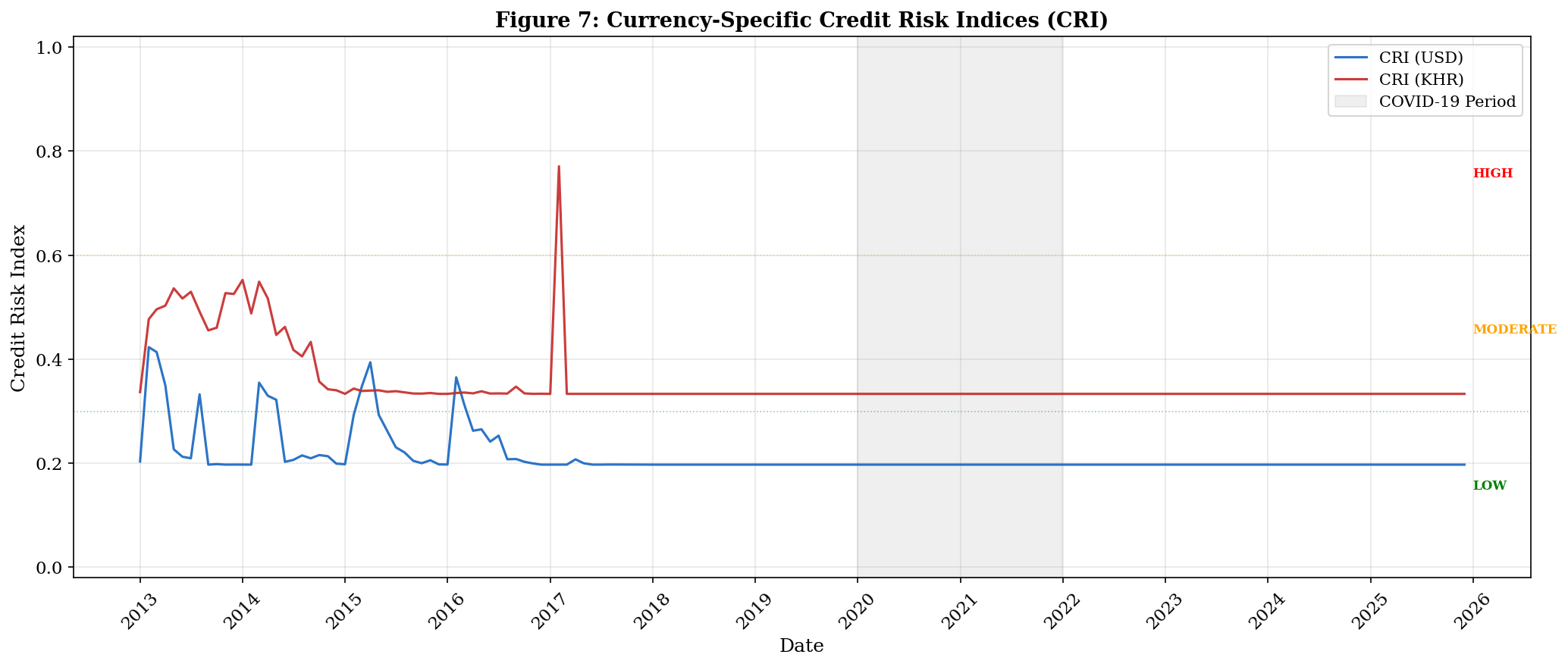 2013–2017 — HIGH RISK (CRI > 0.6 for KHR): The KHR CRI operated in the “HIGH” risk zone, peaking near 0.7. This reflects both the elevated crisis probability (spreads near the threshold) and the high structural volatility. The USD CRI peaked in the “MODERATE” zone (~0.4). This was a period of genuine dual-currency credit risk asymmetry — borrowers in KHR faced significantly worse credit conditions.