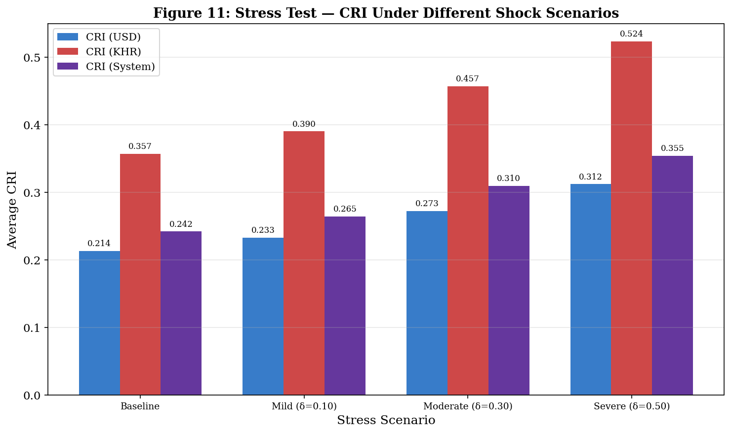 Pattern Observed: All three CRI measures (USD, KHR, System) increase monotonically from Baseline → Mild → Moderate → Severe, confirming the CRI framework produces directionally correct responses to stress.